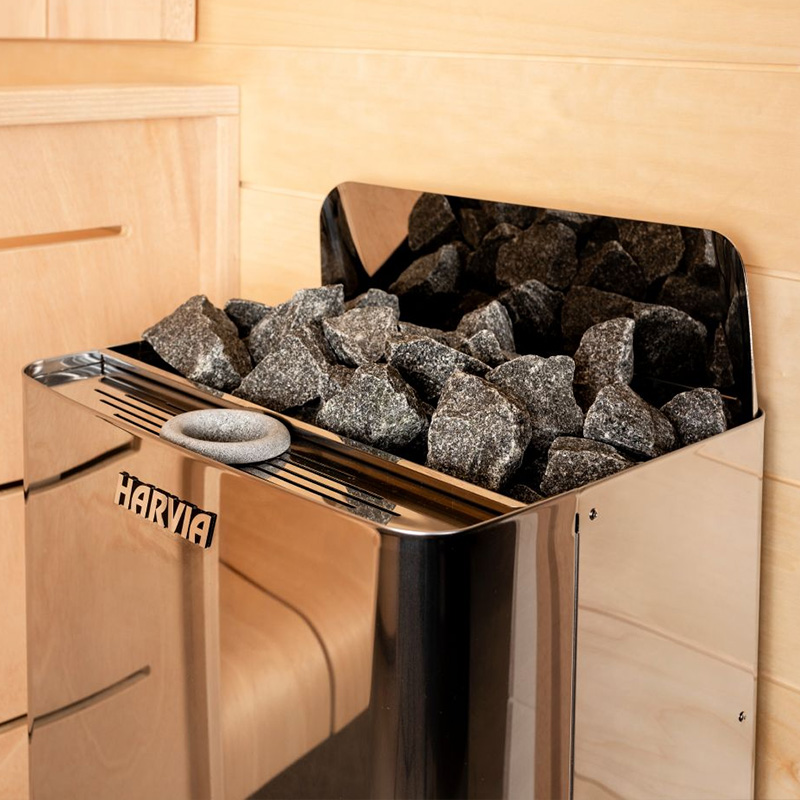Stalowa obudowa w nowoczesnym wykończeniu zapewnia trwałość, odporność na wysoką temperaturę oraz estetyczny wygląd dopasowany do współczesnych aranżacji saun.