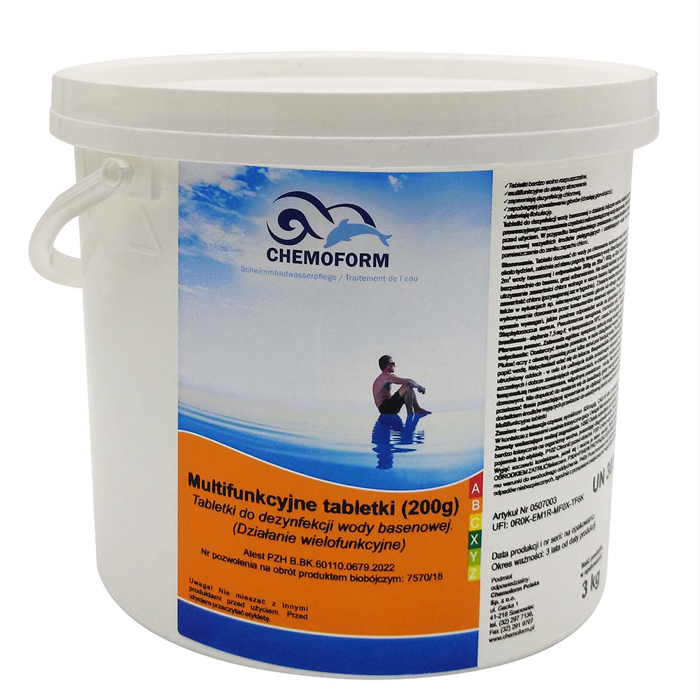 Multifunkcyjne tabletki (200G) to profesjonalny stabilizowany preparat chlorowy w postaci wolno rozpuszczających się tabletek o wadze 200 g jest doskonałym rozwiązaniem do długotrwałej dezynfekcji wody basenowej. Dzięki swojemu multifunkcyjnemu działaniu, ten preparat zapewnia kompleksową ochronę i utrzymanie czystości basenowej w długim okresie czasu.