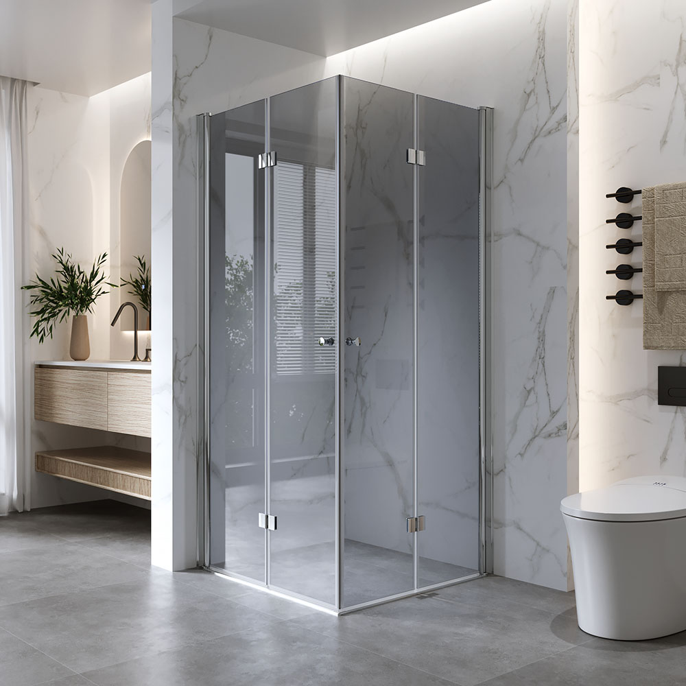 Nowoczesna kabina prysznicowa o wymiarach 90×90×195 cm, zaprojektowana z myślą o wygodzie i elegancji w każdej łazience. Wykonana z bezpiecznego szkła hartowanego o grubości 6 mm, z powłoką ułatwiającą czyszczenie. Przezroczyste szyby w subtelnym odcieniu szarości nadają kabinie nowoczesny charakter i lekkość wizualną. Składana konstrukcja z dwuskrzydłowym mechanizmem typu harmonijkowego, oparta na zawiasach obrotowych, gwarantuje maksymalną oszczędność miejsca i komfort użytkowania. Kwadratowy kształt oraz chromowane profile idealnie pasują do klasycznych i nowoczesnych wnętrz. Kabina przeznaczona jest do montażu na płytkach – bez brodzika.