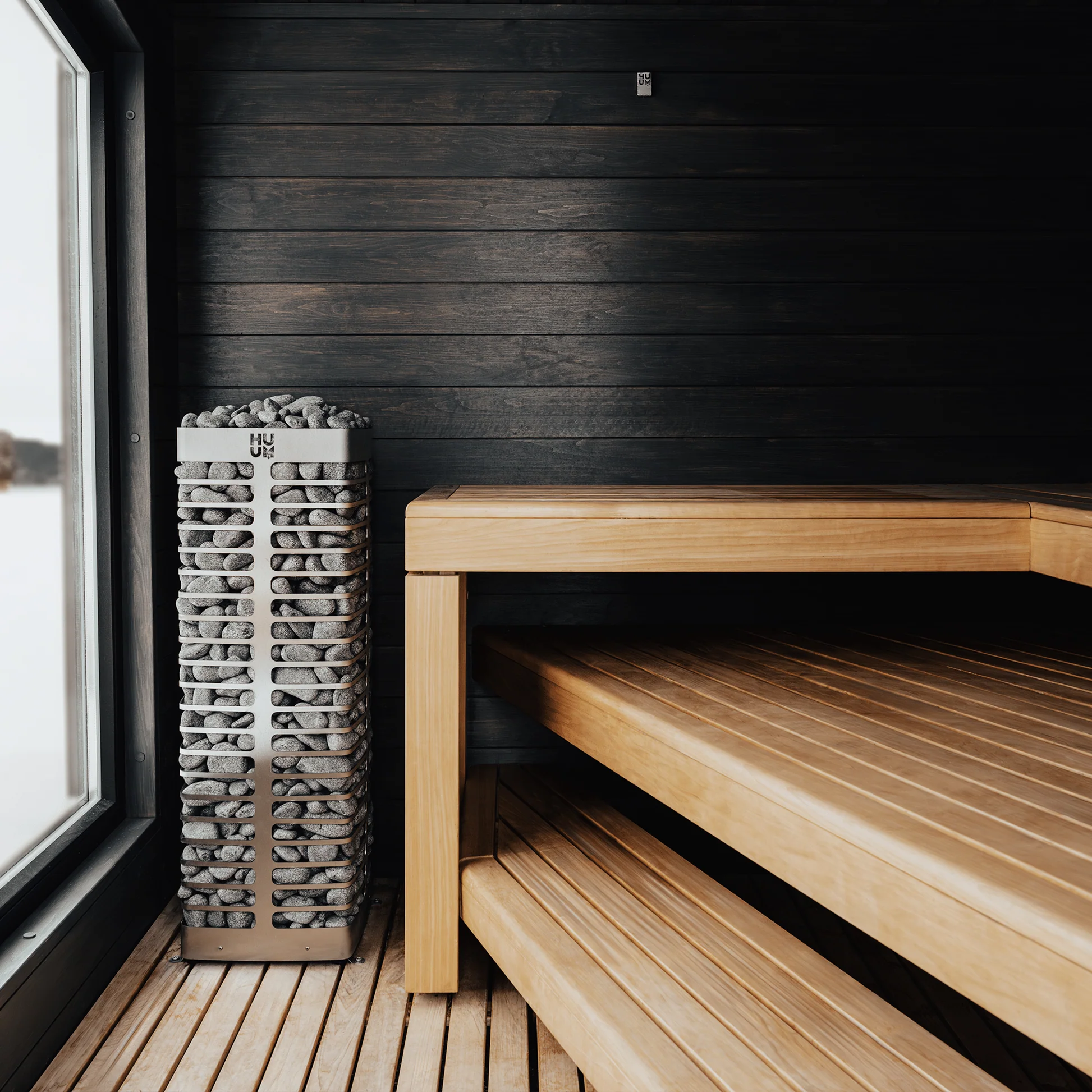 HUUM STEEL 11 kW to nowoczesny, smukły piec elektryczny do sauny, zaprojektowany z myślą o kompaktowych oraz średnich pomieszczeniach saunowych. Minimalistyczna konstrukcja ze stali nierdzewnej, niewielkie odległości bezpieczeństwa oraz możliwość częściowej zabudowy sprawiają, że model ten doskonale sprawdza się w nowoczesnych aranżacjach saun domowych.