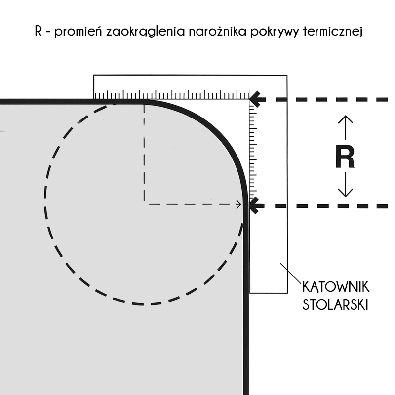 Aby poprawnie określić promień narożnika, należy go zmierzyć kontownikiem stolarskim, tak jak pokazano na załączonym obrazku. Dzięki temu pomiar będzie precyzyjny i umożliwi wykonanie pokrywy idealnie dopasowanej do kształtu spa.