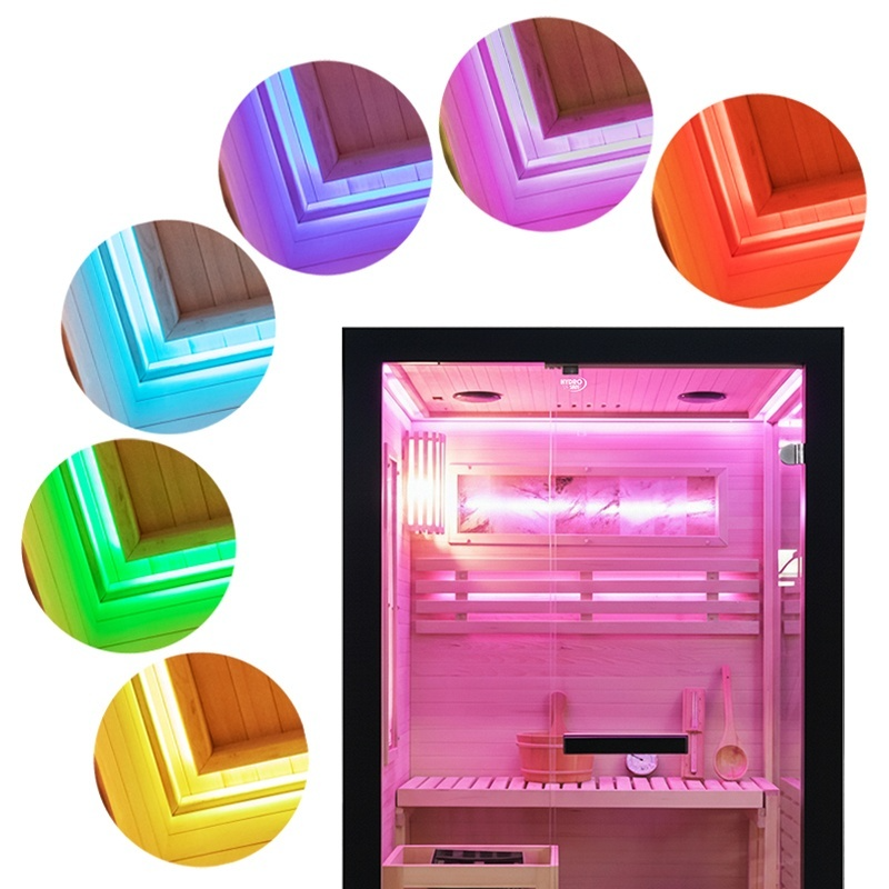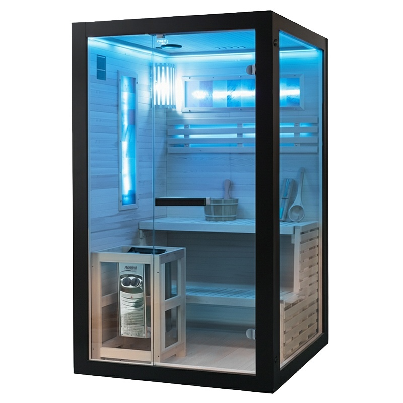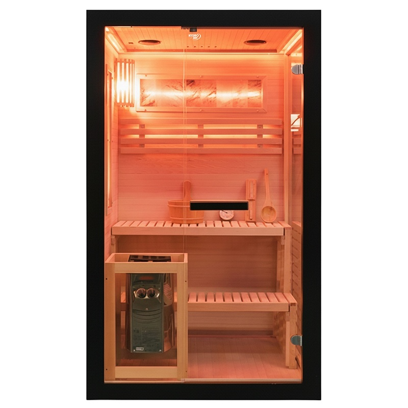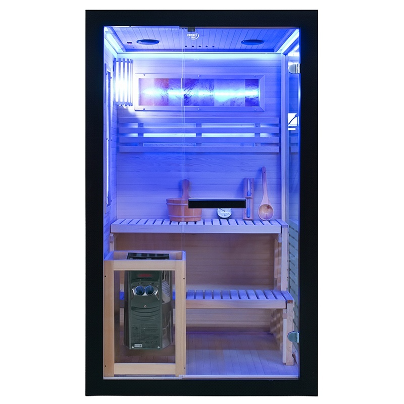 Kabina wykonana z jodły kanadyjskiej (Hemlock) gwarantuje trwałość, odporność na wysoką temperaturę i wilgoć oraz odpowiednią izolację cieplną. Przeszklenia z hartowanego szkła 8 mm zwiększają bezpieczeństwo oraz doświetlenie wnętrza.
