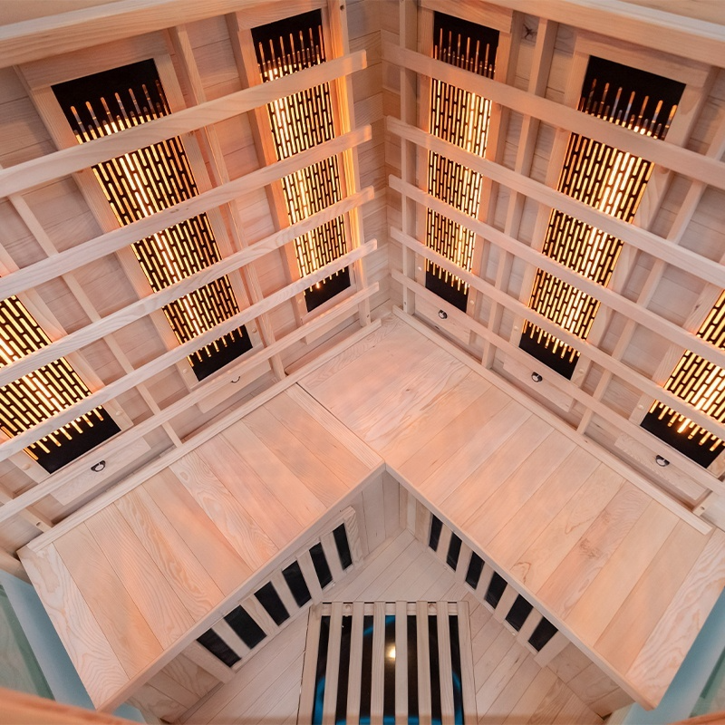 • Zaawansowana technologia grzewcza: aż 9 grzejników – 3 karbonowe i 6 kwarcowych typu full spectrum – gwarantują szybkie i równomierne nagrzewanie całego wnętrza. Łączna moc to aż 2340 W.