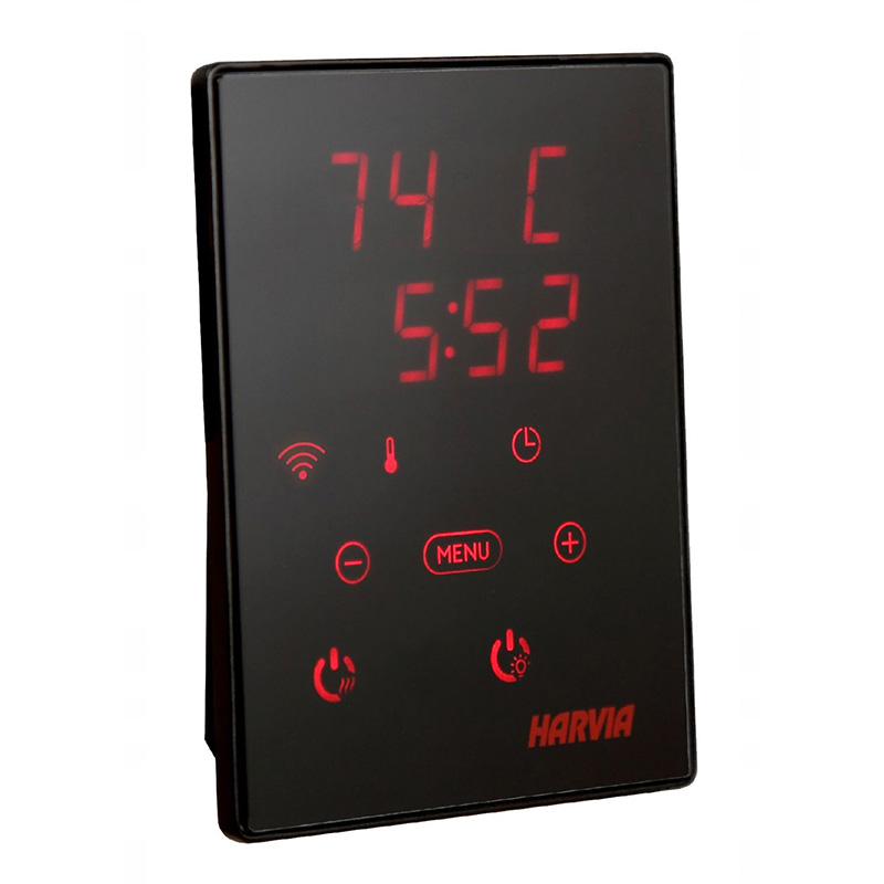 Dotykowy, czarny panel sterowania z czerwonym podświetleniem można zamontować zarówno wewnątrz, jak i na zewnątrz sauny (w suchym pomieszczeniu). Dzięki zintegrowanej funkcji WiFi oraz kompatybilności z aplikacją mobilną MyHarvia (Android/iOS), sterowanie sauną jest możliwe z dowolnego miejsca.