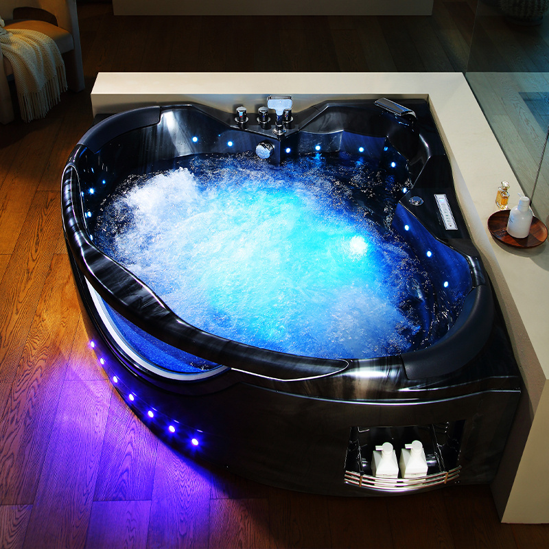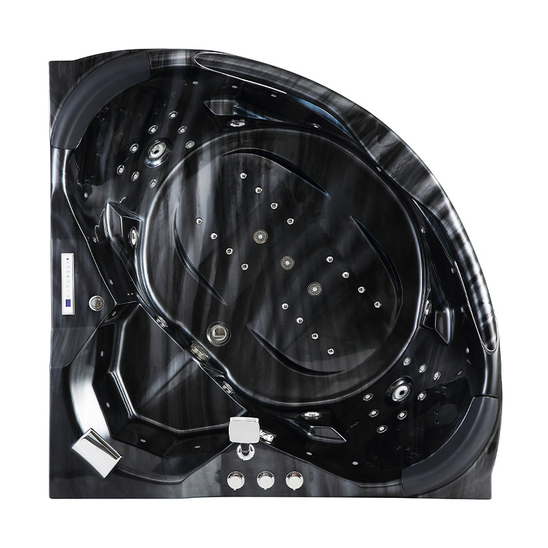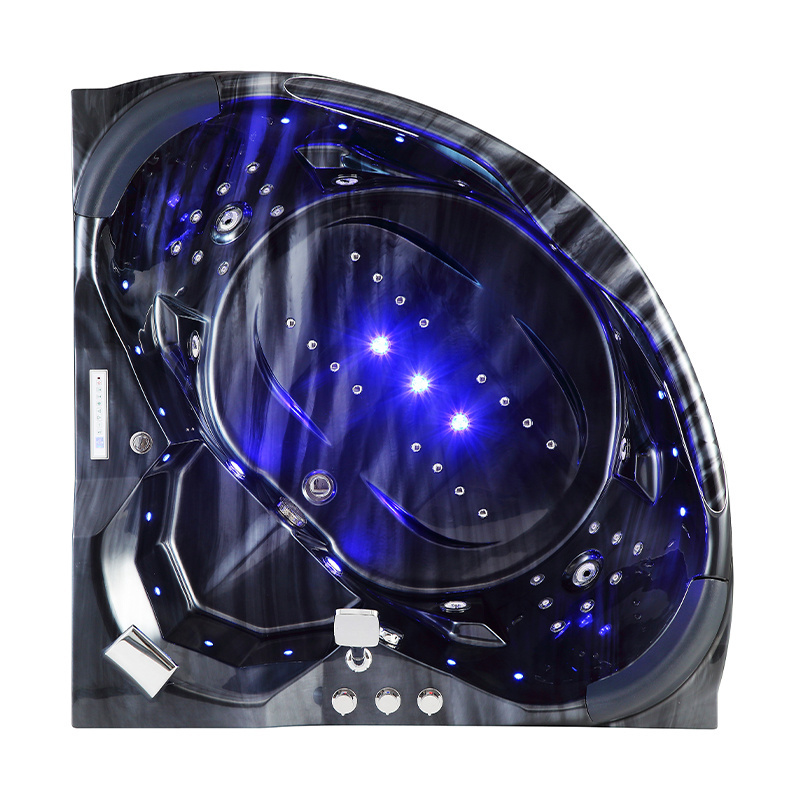 Wanna narożna z hydromasażem 155×155 cm – 43 dysze, koloroterapia, ozonowanie, czarna fala, 2-osobowa