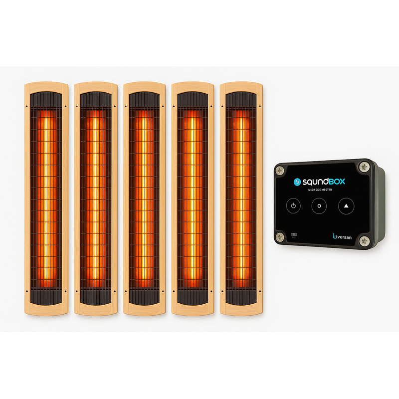 Zestaw składający się z 5 promienników kwarcowych Full Spectrum o mocy 400W każdy oraz inteligentnego sterownika BleBox SaunaBox to kompletne, gotowe do montażu rozwiązanie, które pozwala stworzyć wydajną, komfortową i w pełni zautomatyzowaną saunę na podczerwień.